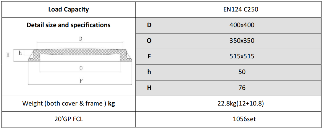 | 3 | For gullytops installed in the area of curbside channels of roads | C250 | 250 kN | 56,200 lbs. |
