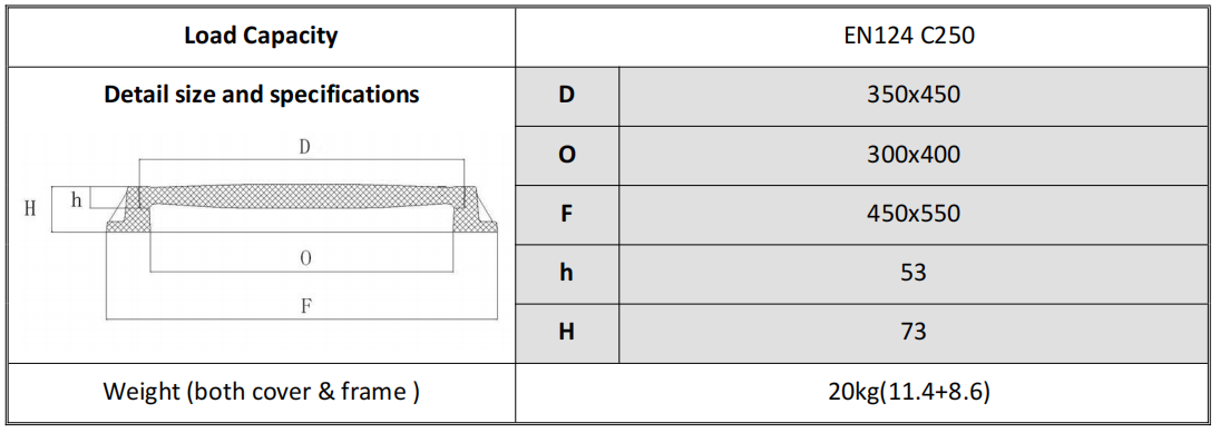 | 3 | For gullytops installed in the area of curbside channels of roads. | C250 | 250 kN | 56,200 lbs. |
